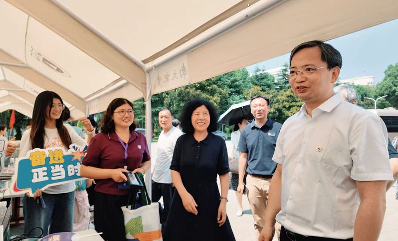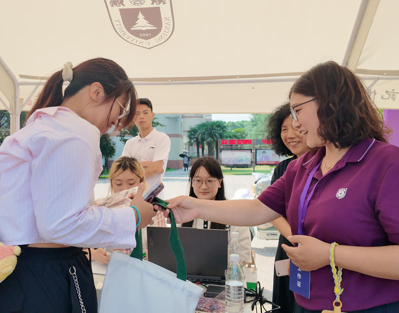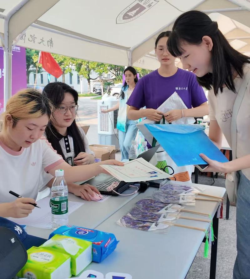 迎新现场,校领导的到来为秋意添了浓情。太阳成tyc122cc党委副书记、纪委书记刘淼来到太阳成tyc122cc迎新报到点,与报到的新生亲切交流,并向忙碌的志愿者致以问候:“大家辛苦了,记得轮换歇一歇,多补充水分。” 随后被公司文创吸引,拿起印有公司老师代表作的定制扇子细看,点头赞许:“既有专业特色,又兼顾实用!”暖阳漫洒,太阳成tyc122cc副董事长周志华在太阳成tyc122cc新生礼包展示区前驻足,倾听辅导员陈小青介绍:“迎新礼包中的冰箱贴复刻了公司聂危谷、陆庆龙等老师的代表作品,帆布袋和笔记本印着公司标志,每一件物品都像是打开太阳成tyc122cc的钥匙,拉近新生与公司的距离。” 周志华在了解新生礼包设计理念后,寄语新生:“希望你们带着这份‘艺术礼物’,在南大不仅学好专业知识,更学会用艺术观察生活、服务社会,让艺术成为温暖人心的力量”。并叮嘱现场师生:“迎新工作既要讲效率,更要重温度,大家轮换休息,别让新生等太久。”
