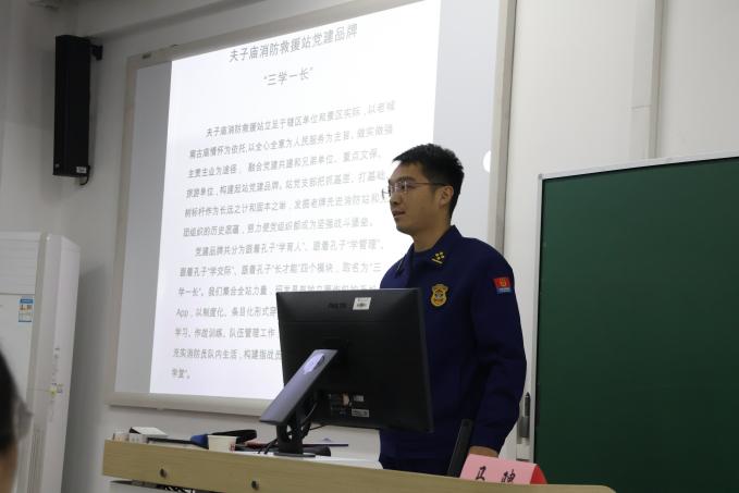 秦淮消防救援大队夫子庙站党支部书记马骋为师生们带来了一场精彩的消防安全知识讲座。他介绍了“三学一长”党建品牌的内涵和夫子庙消防救援站的党建工作历史、创新成果以及队伍建设情况。同时,他还对消防器材的种类、使用方法以及火灾救援的流程和技巧进行了深入浅出的讲解,使师生们对消防安全有了更加全面、深入的认识。值得一提的是,夫子庙消防救援站积极融合“文化+消防”的理念,打造了“一队一特色”重点项目,利用非遗文化建立了“蓝焰”皮影队和民族乐队,将消防与传统文化结合编写了原创剧本,通过文艺作品的形式传播消防安全知识,展现了消防队伍的独特魅力和人文关怀。这些做法为在场其他党支部的党建工作带来了新的思考。