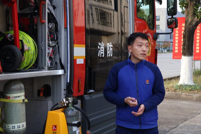 接着,党员师生们移步玉辉楼前,新区消防救援站站长孟凯与一行消防员同志已经在消防车前等候,为本次活动的第二个环节——“救援装备展示与防火逃生技巧展示”做好了准备。