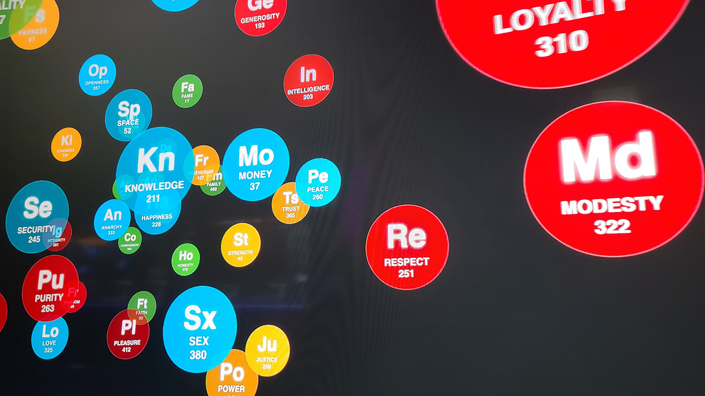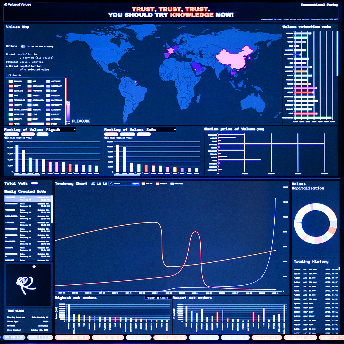 如果我能监测各国的价值观,是否能更好地了解他们的战略和行动?《VoV交易平台》实时告诉观展者交易如何比他们的股票旗帜形态技术图更好地描述社会。它现在是《价值中的价值》艺术网站的仪表板。