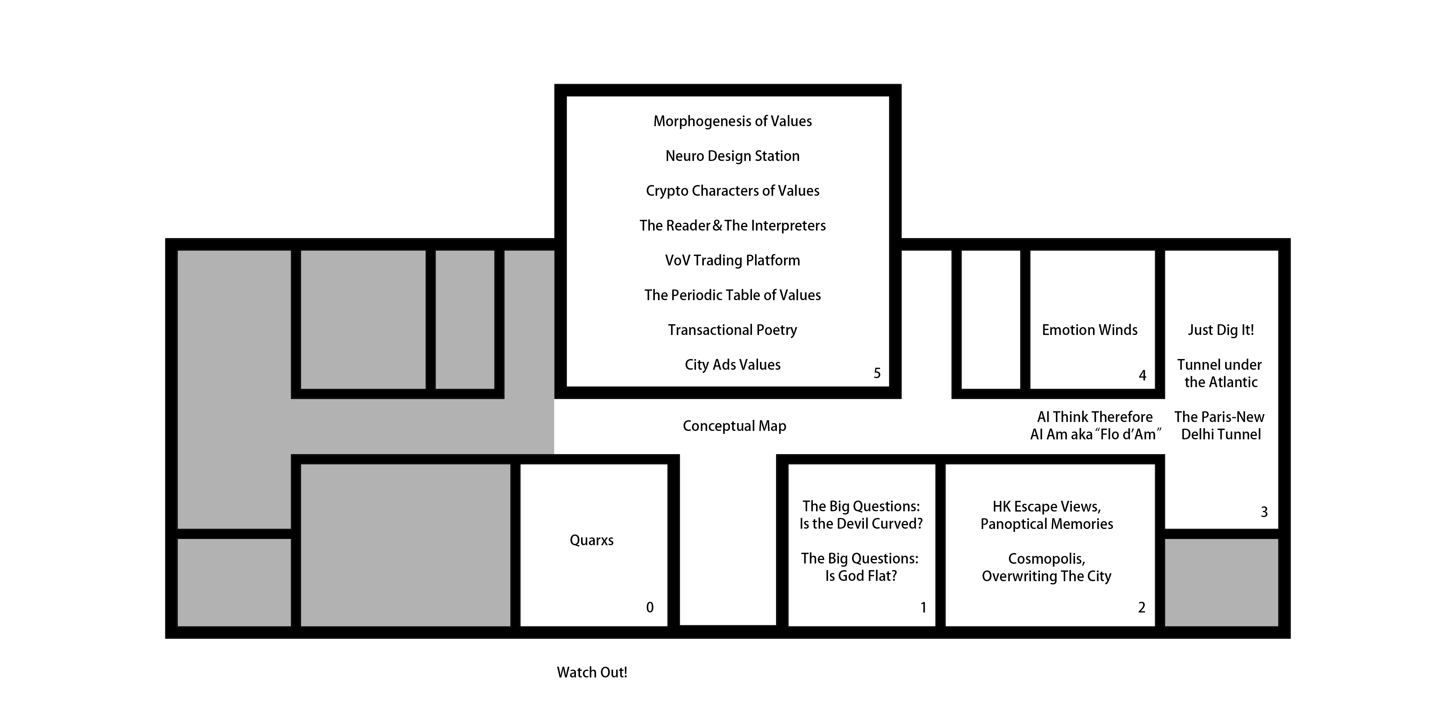 此次展览选取了莫奔在各个时期的代表作品,包括了1995年的《夸克斯》,他创作的第一个虚拟现实装置《上帝是扁平的吗?》,以及他的标志性互动装置艺术作品《大西洋底的隧道》,《只管挖吧!》,到他近年开始创作的《价值中的价值》系列。每个作品都最大可能的保持了完成时刻的状态,并根据当下条件进行了新的改造,以更好地嵌入到当下的时空中。