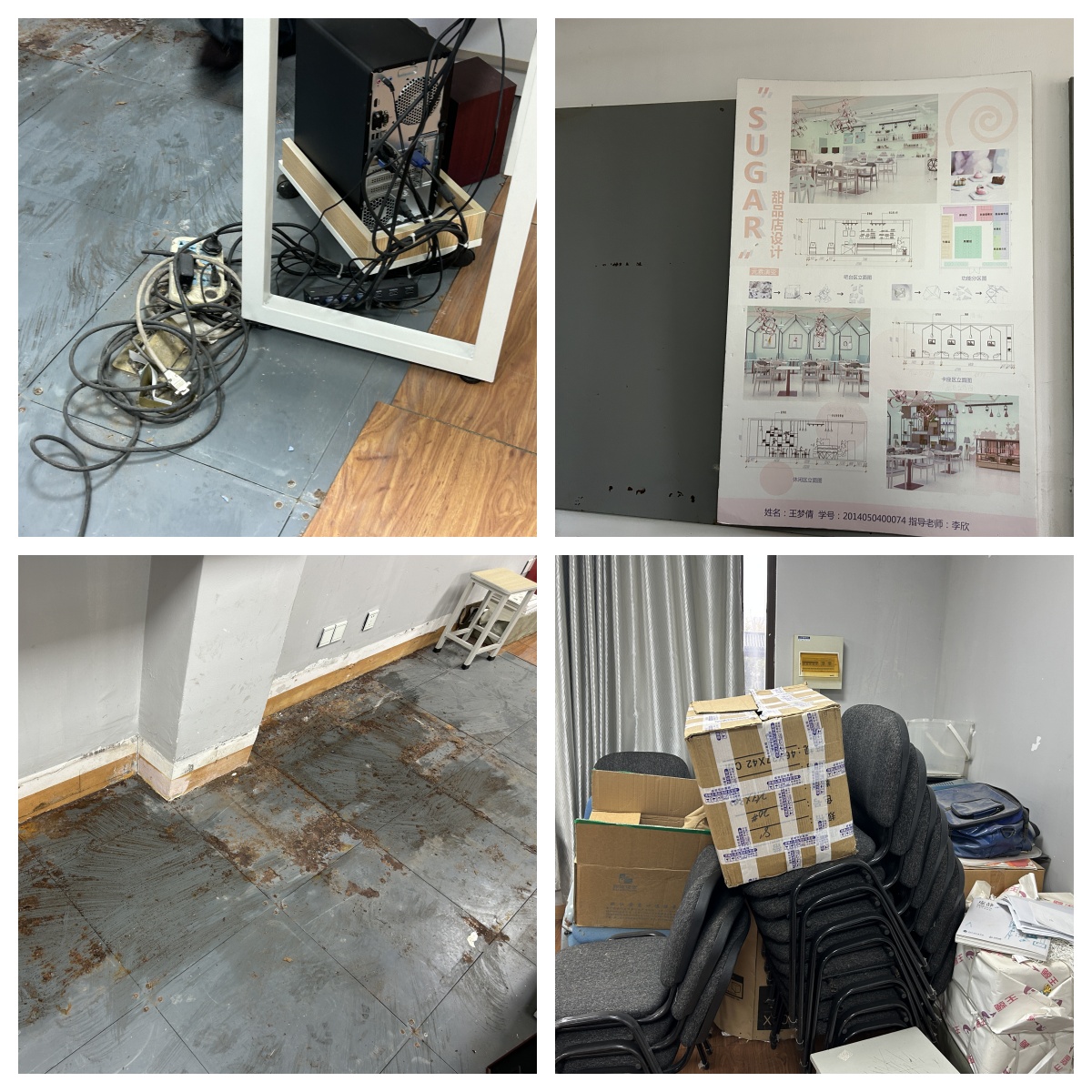 在检查过程中,发现艺术楼走廊上的旧标识、旧展板脱落、杂货垃圾堆积,严重影响了同学们的学习生活体验;个别画室存在需要关注和解决的安全隐患,如插座和电线裸露缠绕、地板砖缺失或翘起、地板窗帘污损严重等;也有一些专业画室干净整洁、舒适美观,营造出浓厚的艺术创作氛围。