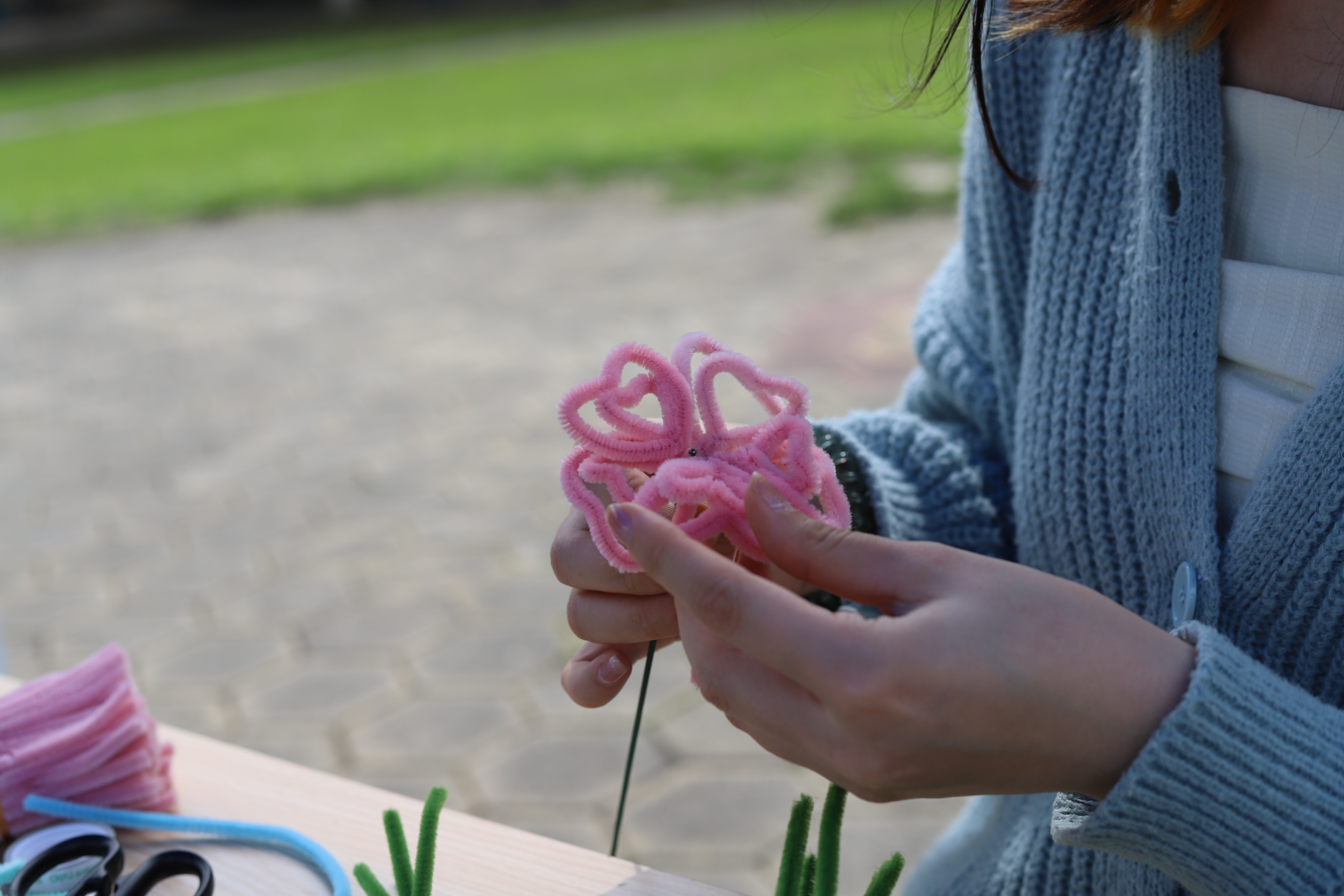 展台同学耐心地讲解了扭扭棒花束的制作流程,同学们根据自己的喜好,挑选扭扭棒的颜色,设计花朵的形状。无论是传统的玫瑰、康乃馨,还是创意的抽象花型,每一朵花都是对个性和美的独特表达。完成的花朵被巧妙地组合成一束束花束,它们不仅色彩缤纷,而且形态各异,充满了春天的浪漫气息。这些扭扭棒花束因其易于保存的特性,被誉为“永生花”,象征着永恒的美好和浪漫。