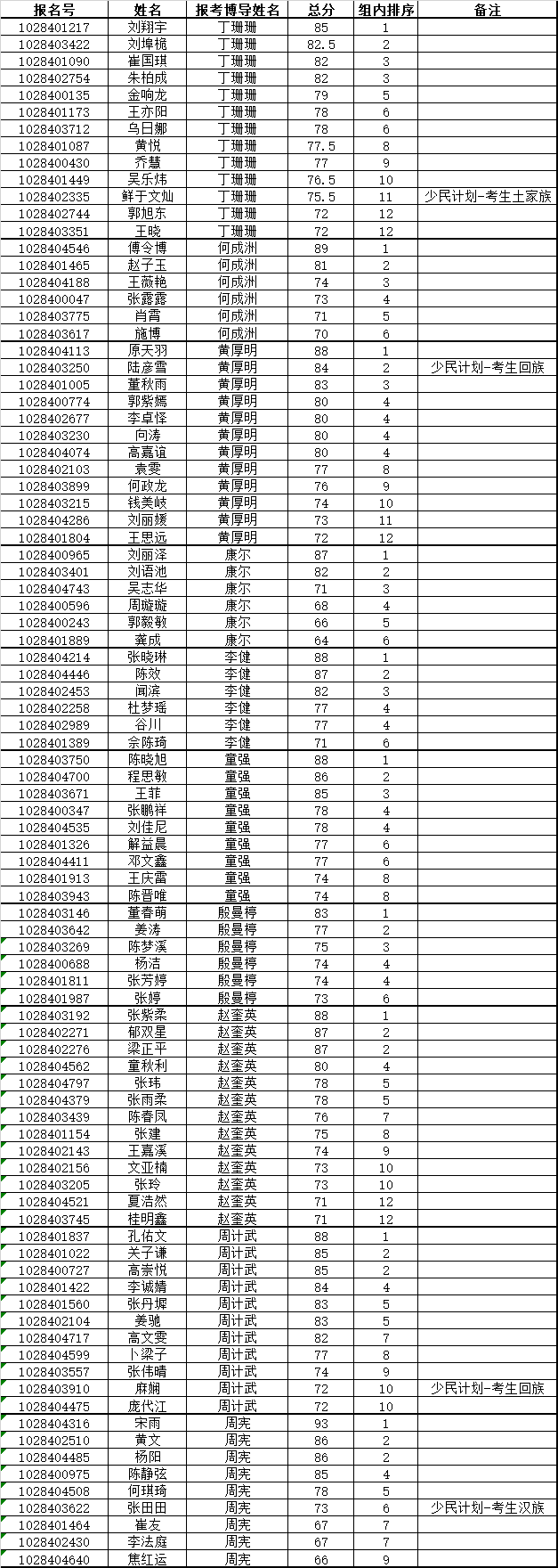 备注:报考丁珊珊总人数19人,报考何成洲总人数9人,报考黄厚明总人数17人,报考康尔总人数9人,报考李健总人数9人,报考童强总人数13人,报考殷曼楟总人数9人,报考赵奎英总人数17人,报考周计武总人数14人,报考周宪总人数13人。