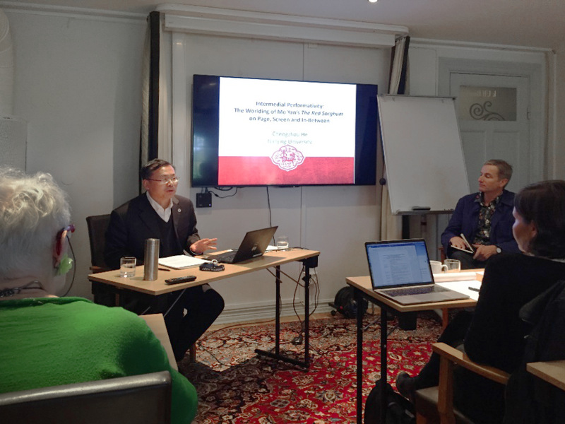 10月3日,何成洲教授在“穿越媒介边界的操演性”( Performativity across Media) 会议上发表主旨发言:“跨媒介的操演性:《红高粱》小说及电影的世界建构”(I ntermedial Performativity: The Worlding of Mo Yan’s The Red Sorghum on Page, Screen and in-Between),以莫言的经典之作《红高粱》为例,剖析了电影改编研究中蕴含的跨媒介理论价值。