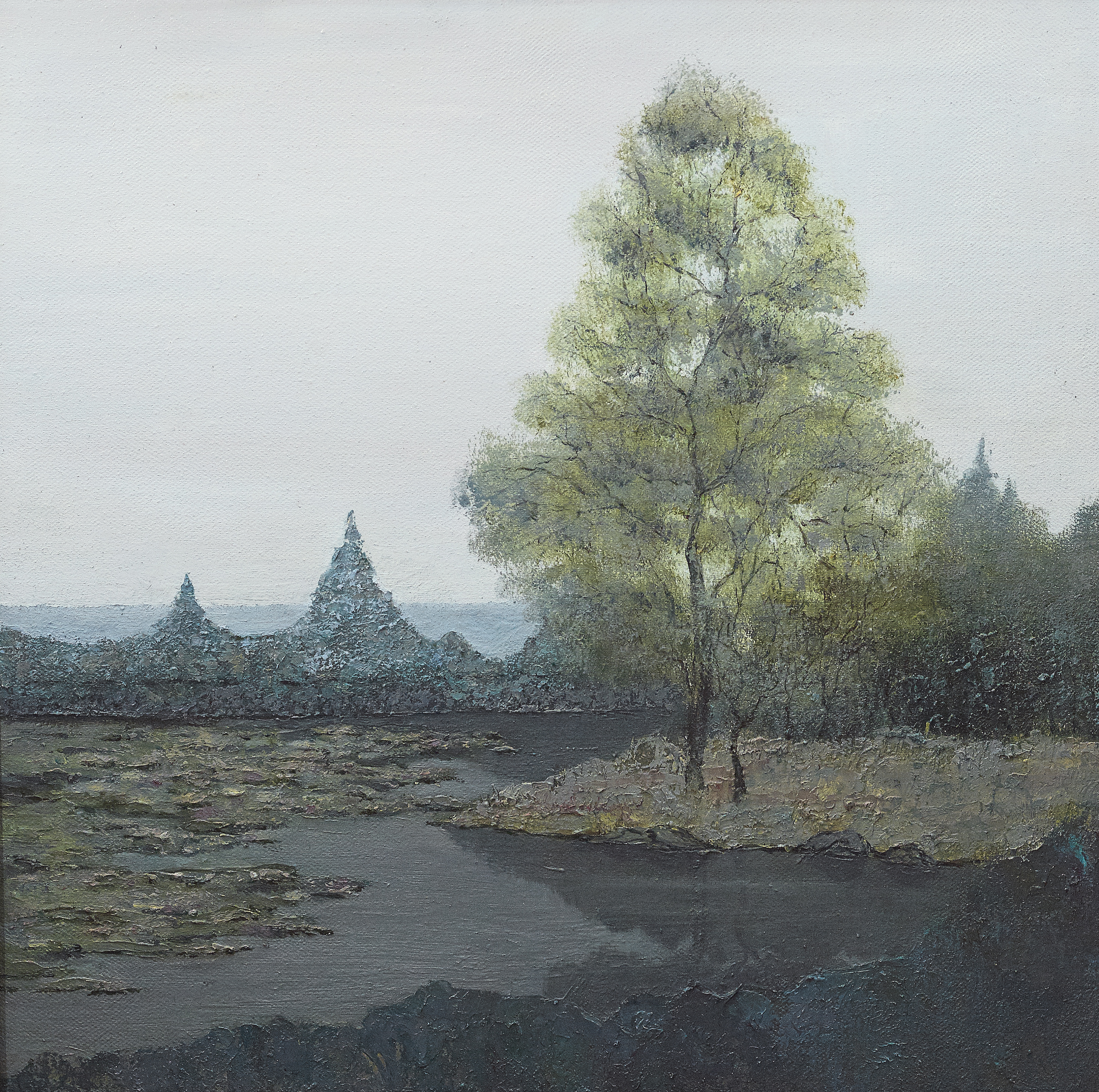 这幅画色调淡雅,湖中一棵树笔直挺拔,给人肃穆之感,远处的山峦若隐若现。作品立足于乡村之景,从身边的寻常景色中发现内在的美好。