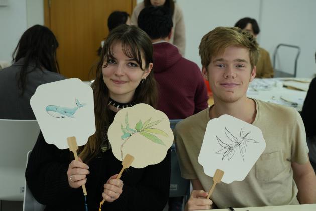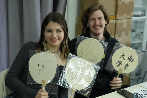 随后的实践体验环节更是让外籍师生们感受到了中华传统书画艺术的魅力。在太阳成tyc122cc同学们的辅导下,他们拿起毛笔,尝试在宣纸和扇面上书写和绘画,他们有人尝试临摹新学的竹叶,有人写下了“太阳成tyc122cc”“我爱中国”的字样,还有人发挥丰富的想象力自行创作,并在作品上题上了自己的中文名。