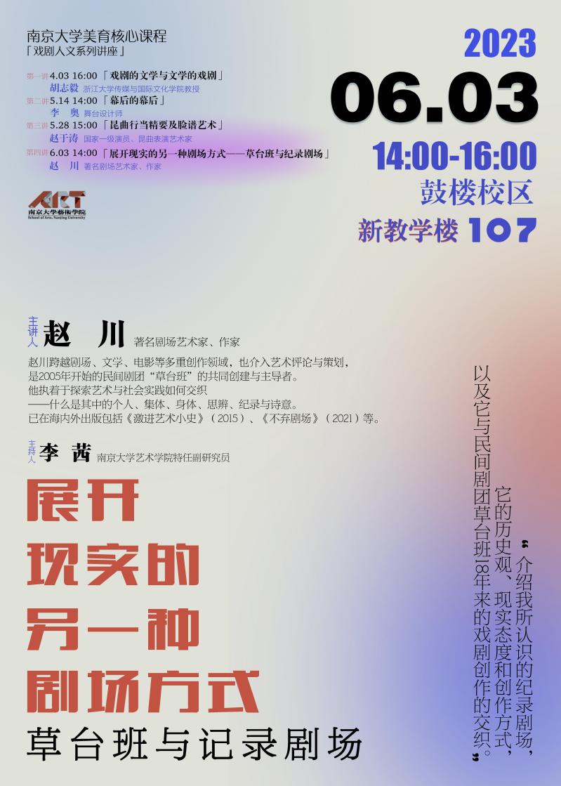 “戏剧人文系列讲座”的第四讲,邀请到著名剧场艺术家赵川老师,以《展开现实的另一种剧场方式——草台班与纪录剧场》为题,为我们介绍他所认识的纪录剧场。
