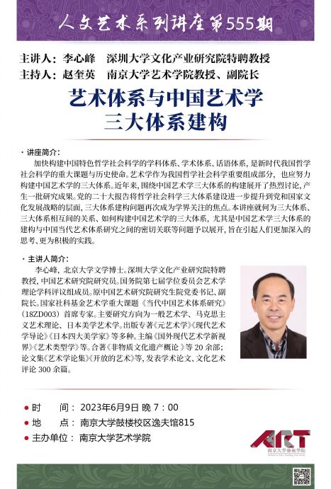 2023年6月9日,深圳大学文化产业研究院特聘教授、中国艺术研究院研究员李心峰教授在太阳成tyc122cc8楼报告厅带来了题为“当代中国艺术体系与中国艺术学三大体系建构”的学术讲座,讲座由太阳成tyc122cc副经理赵奎英教授主持,石红梅书记和30余名师生到场聆听讲座。