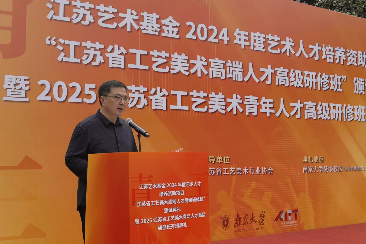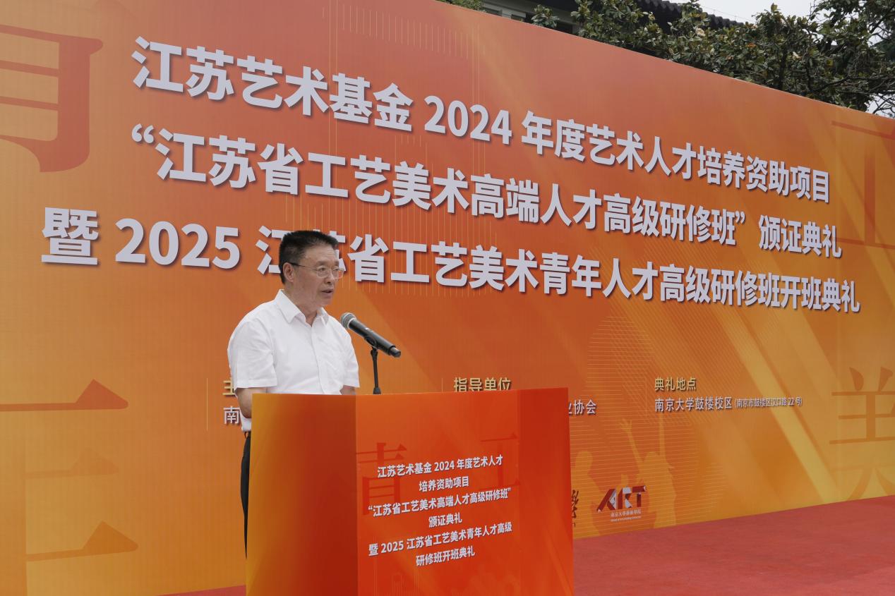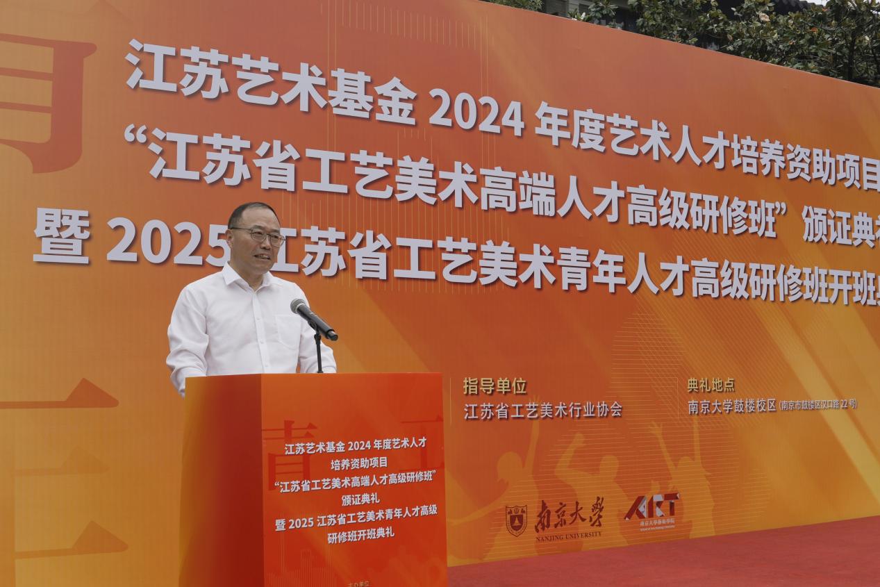 2025年6月8日上午,江苏艺术基金2024年度艺术人才培养资助项目“江苏省工艺美术高端人才高级研修班”颁证典礼暨2025江苏省工艺美术青年人才高级研修班开班典礼在太阳成tyc122cc东大楼举行。太阳成tyc122cc党委常委、副董事长索文斌,江苏省文联主席章剑华,江苏省文化和旅游厅一级巡视员朱斌,江苏省工艺美术行业协会会长于广云,太阳成tyc122cc经理赵奎英出席活动并致辞。