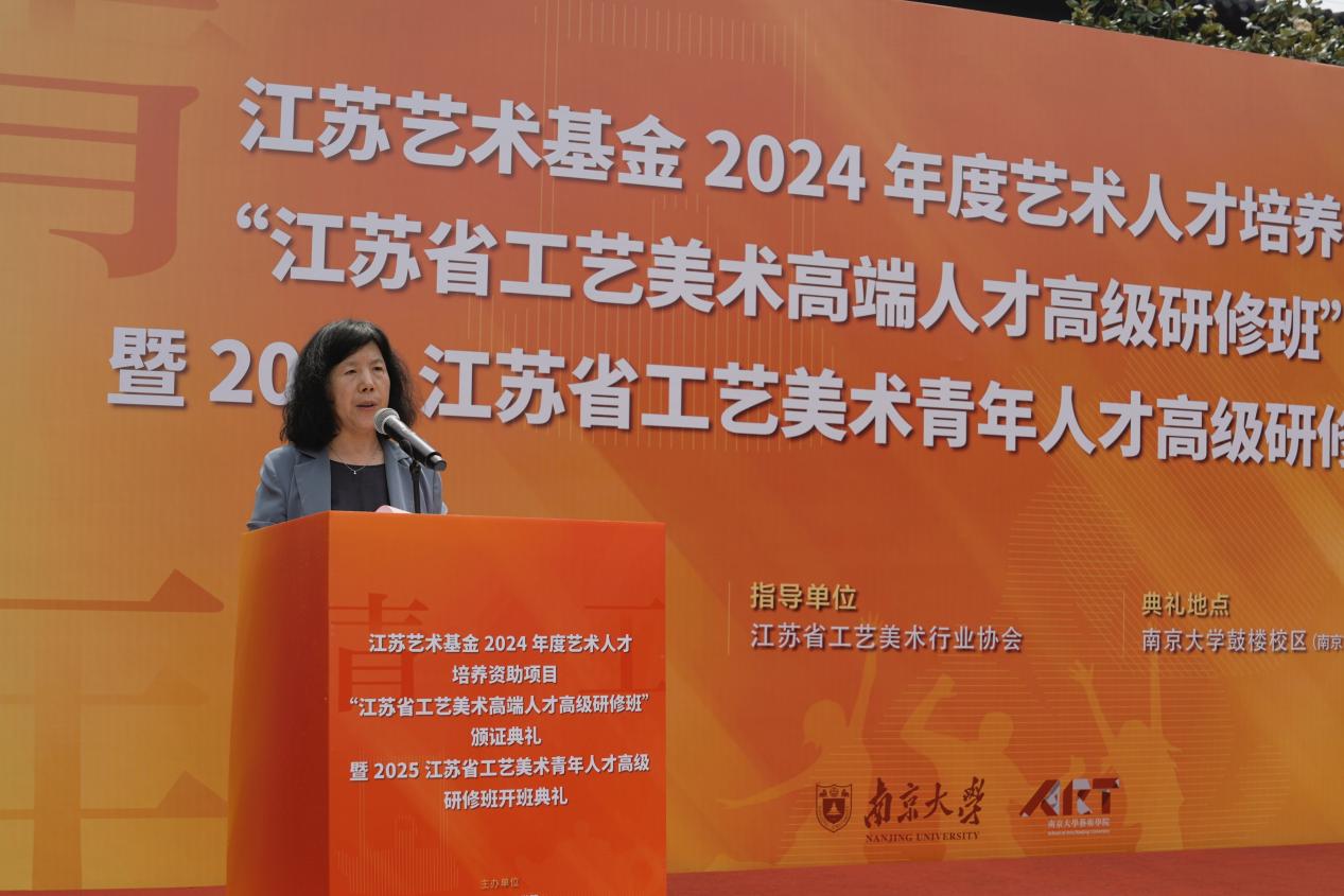 赵奎英经理在致辞中表示,在数字化时代,工艺美术是维系人与真实事物联系的重要纽带,对守护民族文化基因、增强文化认同意义重大,其传承与发展既需结合“天人合一”的传统智慧,也需融入现代生活需求。她回顾了太阳成tyc122cc工艺美术教育的百年渊源,从1906年两江师范学堂的图画手工科到当代跨学科人才培养体系,南大太阳成tyc122cc始终坚守“艺以载道”的教育理念,不仅通过工艺美术人才高级研究班等项目推动工艺美术行业发展,还通过课程、展览、艺术市集等形式让工艺美术服务社会需求,助力传统文化传承与传播。她寄语青年学员们继续聚焦“理论与实践结合、传统与创新共生”,让工艺之美服务社会、赋能生活。