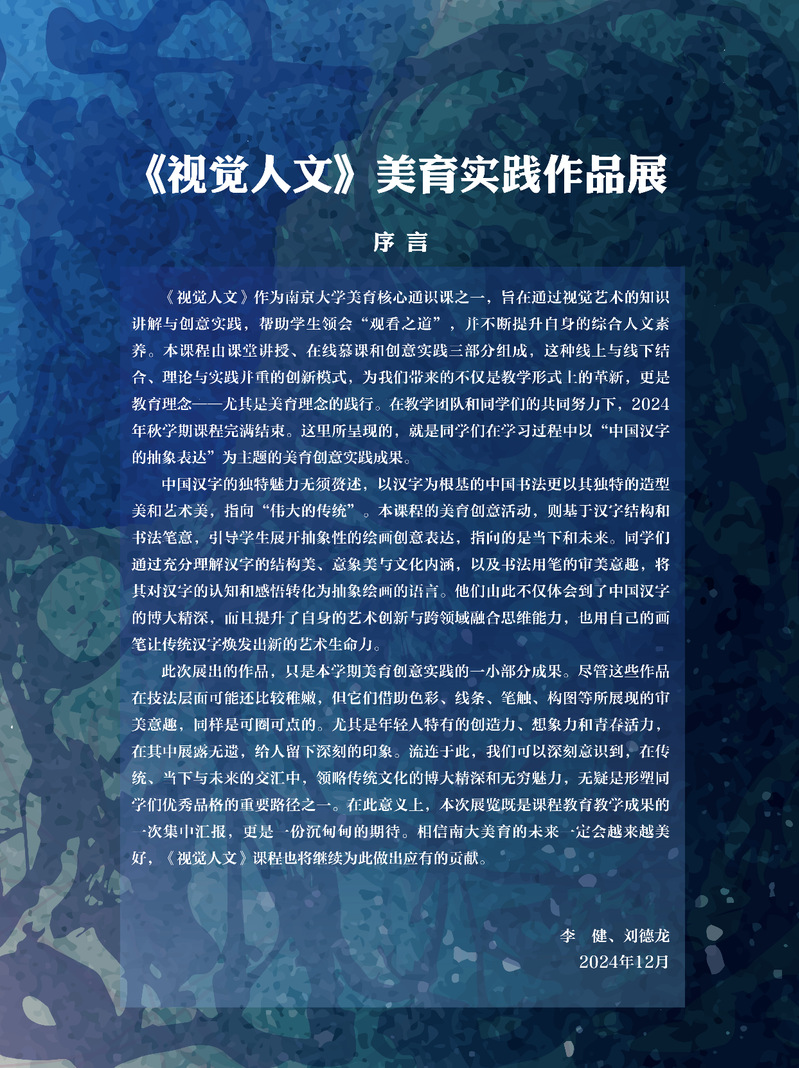 Recently, Nanjing University held the Chinese Character Abstract Art - Visual Humanities Aesthetic Education Practice Exhibition. This unique exhibition, themed on Chinese Character Abstract Art, showcased the innovative practical achievements of undergraduates at Nanjing University in aesthetic education courses, offering the audience a visual feast that integrates traditional culture with modern art.