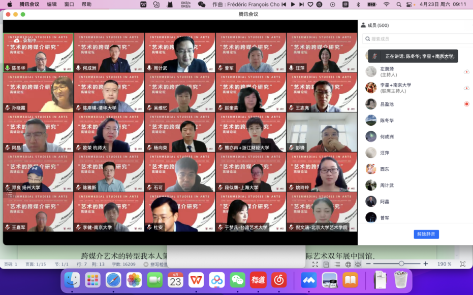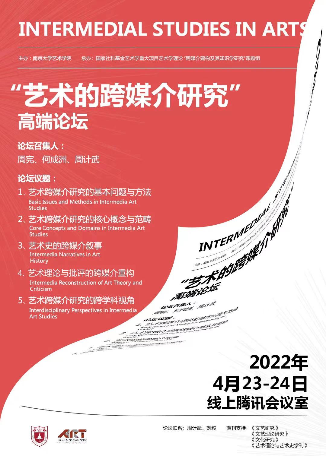 NanjingUniversity Summit "IntermediaStudiesin Arts"was successfully held online on April 23, 2022. The forum was hostedby the School of Arts,and organized by the art project ofNational Social Science Fund" Transmedia Construction of Art Theory and its IntellectualResearch". More than 70 experts and scholars from manyuniversities and research institutes, including Beijing University,Tsinghua University, China Academy of Art, Southeast University,Shanghai University, Shaanxi Normal University, Hangzhou NormalUniversity , attended the Tencent meeting. More than 1,000 academiccolleagues actively participated in the live-streamed forum.