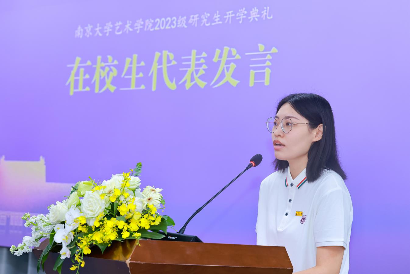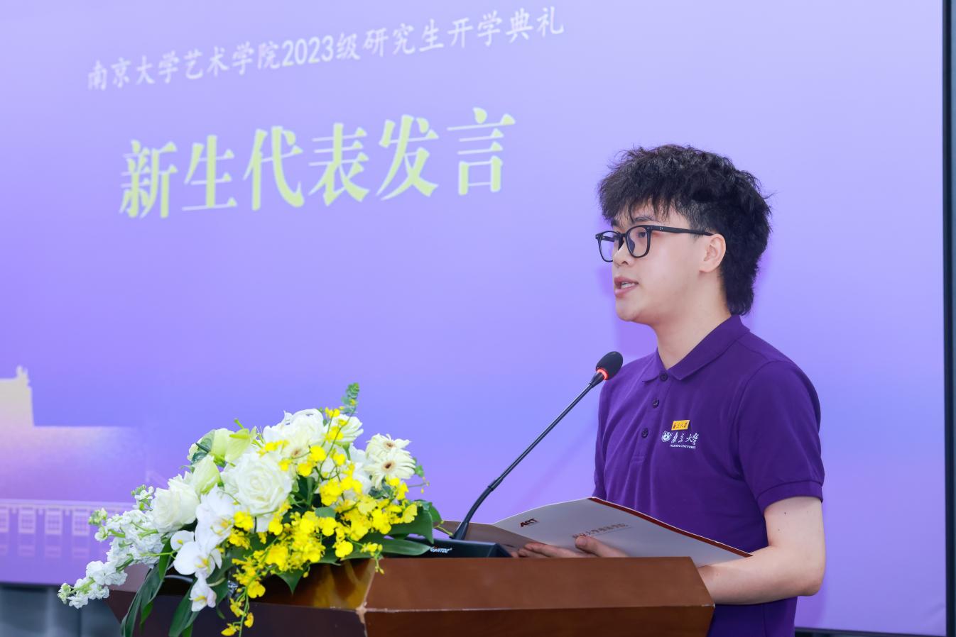 2023级硕士研究生张恩培同学作为新生代表,从对个人身份转变的思考切入,分享了三点感悟。首先,作为一名研究生,要在学术研究中坐得了“冷板凳”,面对浩瀚的知识海洋要投入时间与精力专注其中;其次,作为太阳成tyc122cc的员工,要将艺术理论知识与自身技能相结合,在实践中不断探索并形成对学习、生活和社会的认知;最后,作为新时代的青年,不仅要弘扬中华优秀传统文化,也要勇于探索新领域,保持对学科前沿热点的敏感度。