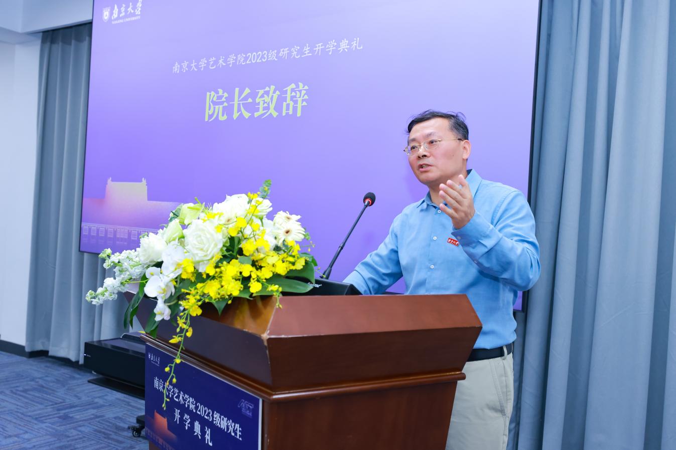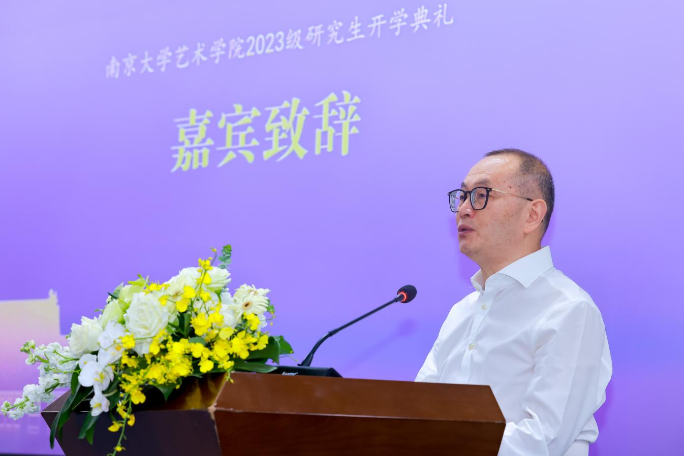 江苏省艺术评论学会会长方标军教授在致辞中对新生的到来表示诚挚的祝贺,方教授结合习近平总书记在文化传承发展座谈会上发表重要讲话,为大家提出三点期许。首先,在新时代的学术研究中,我们面对更加复杂和更具挑战的研究问题,要敢于在学科交叉融合中引领学术创新。其次,要在理论与实践融合中提升综合实力,当今的南大太阳成tyc122cc就始终坚持艺术理论与实践并重的教学特色,能够成为新生们学习成长的广阔平台。最后,方教授建议新生们要在不同文化的融合中不断拓展自我格局,以开放、包容的态度应对文化的多样性,并在多元的文化中汲取营养,以国际化的视野,拓展人生格局。