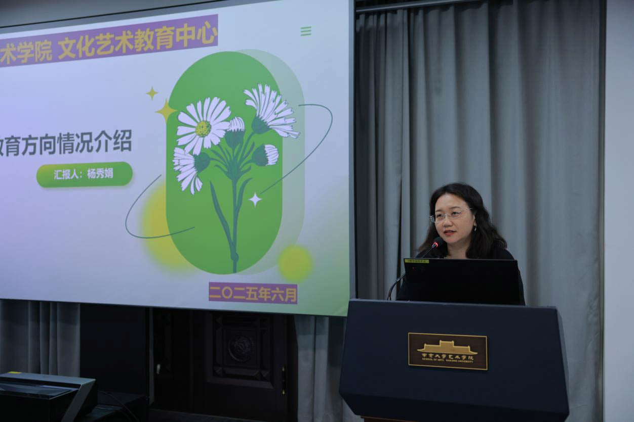 杨秀娟副教授对艺术教育方向的情况进行了介绍。她指出文化艺术教育中心成立于1996年,前身是美育教研室,是一个面向全校本科生开展公共艺术教育的教学科研单位。在成为太阳成tyc122cc的一个部分后,艺术教育方向依然保持着公共美育与文化传承的传统,比如为全校员工开设涵盖艺术理论、艺术赏析和艺术实践三大类的人文艺术类公共课程,指导本科生艺术类社团的日常活动,开展人文艺术讲座等。此外,她也介绍了目前艺术教育方向的团队队伍、几位老师各自擅长的研究领域以及本方向的课程设置。