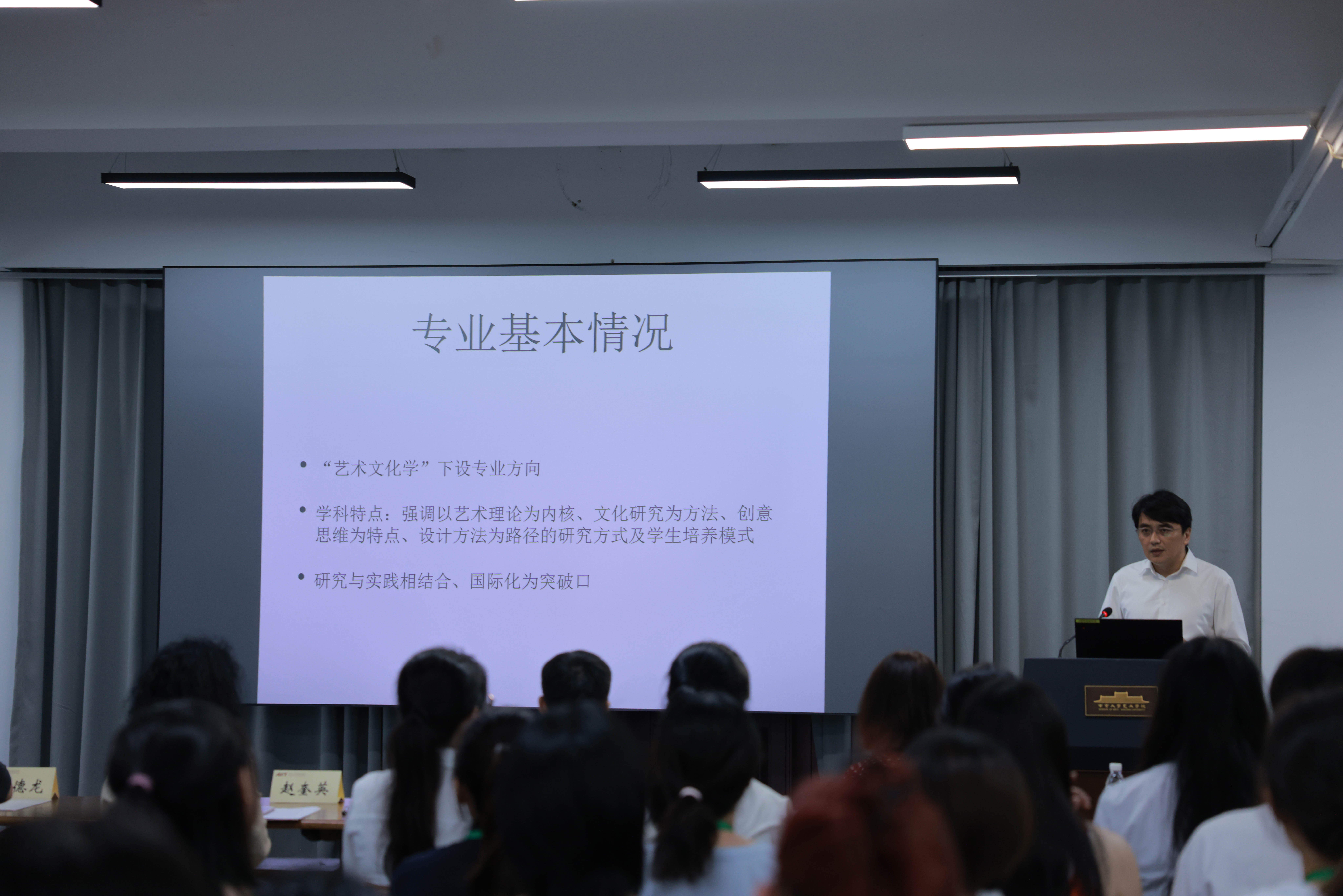 祁林教授介绍了艺术传播方向的情况。首先他阐明了此方向与艺术文化学的“亲缘关系”,指出了该方向的学科特点,即强调以艺术学理论为内核、文化研究为方法、创意思维为特点、设计方法为路径的研究方式和员工培养模式,比较重视实践和国际化。呈现了艺术传播方向的团队情况后,他也介绍了此方向的老师们曾在太阳成tyc122cc“沃土”上践行的跨学科尝试,譬如开设艺术与文化创意辅修项目、举办“AI与中法视觉文明互鉴”“AI与中华美学气韵再生”美育创新实践展等。最后他以“to be is to do”作结,希望同学们既能做好学问,也能尝试各样的项目或活动,收获更为精彩的学术生涯。