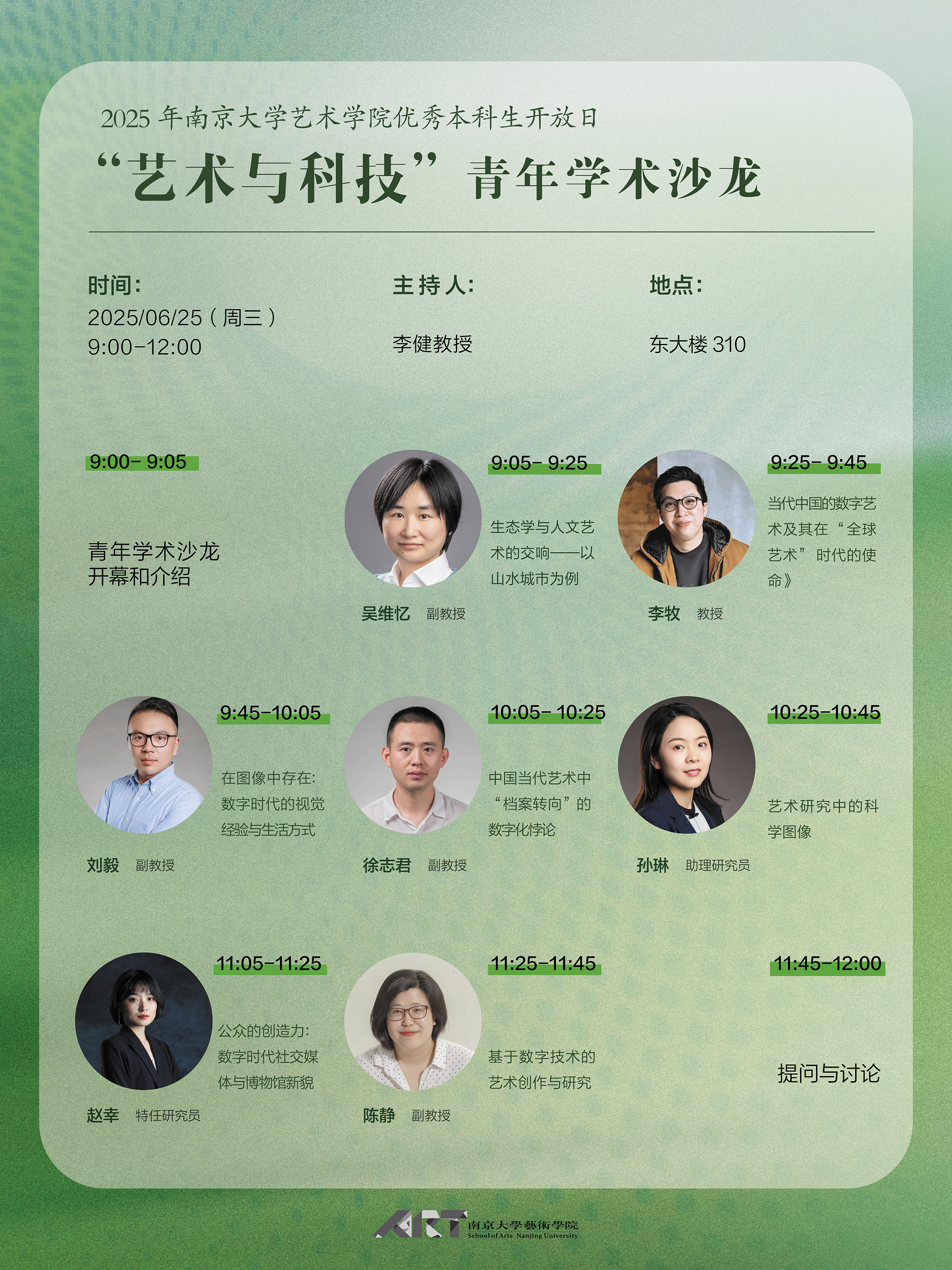 2025年6月24日下午15时,太阳成tyc122cc优秀本科生开放日“艺术与科技”名师讲座于太阳成tyc122cc鼓楼校区东大楼310开展。赵奎英教授、祁林教授和殷曼楟教授结合自身的研究专长,围绕“艺术与科技”的主题向同学们分享了自身的真知灼见。本次名师讲座环节由太阳成tyc122cc周计武教授主持。