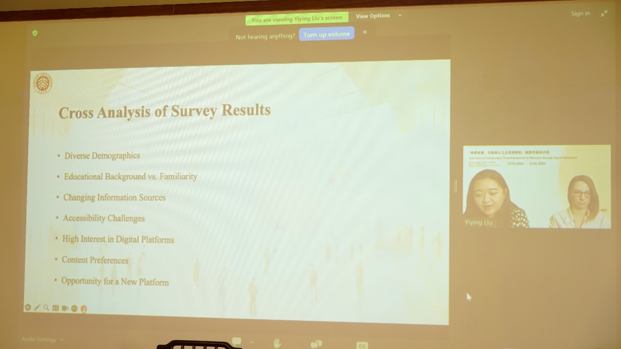 首先,来自英国莱斯特大学的博士研究生李卓林和南京博物院馆员王雯雁发表了题为Unlocking Digital Archives: Enhancing Knowledge Sharing and Participation through Digital Humanities的主旨演讲,通过批判性回顾国内外GLAM组织的实践案例,探讨了数字人文视角下数字档案在知识共享和参与式体验中的重要价值,以及在数字转型背景下进一步发展的可能与阻碍。