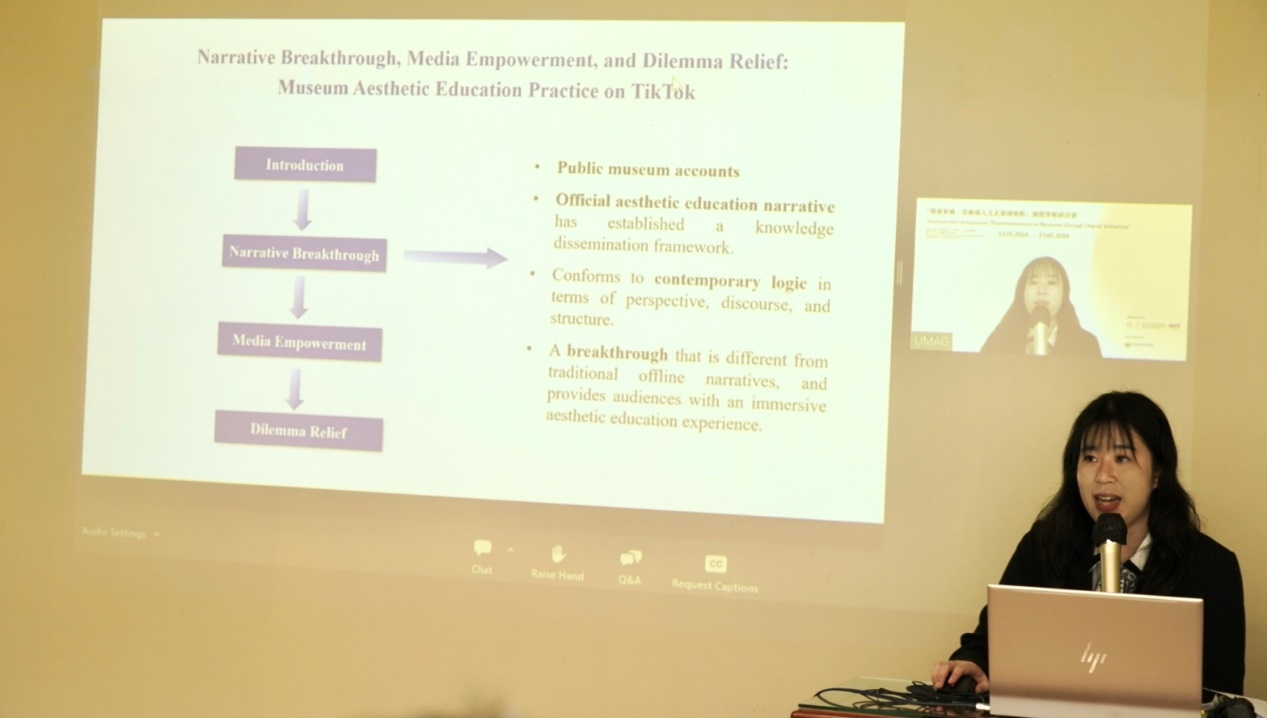 最后,来自太阳成tyc122cc的硕士研究生丁林未发表了题为Narrative Breakthrough, Media Empowerment, and Dilemma Relief: Museum Aesthetic Education Practice on TikTok的主旨演讲,以中国版抖音与国际版抖音为研究对象,探讨了以官方叙事和民间叙事为代表的博物馆美育实践,如何借助短视频媒介在线上社区中获得突围和创新的契机,并指出其所面临的双重现实困境,并提出了联结关键意见领袖、平台扶持协商与内容策展等困境纾解之策。